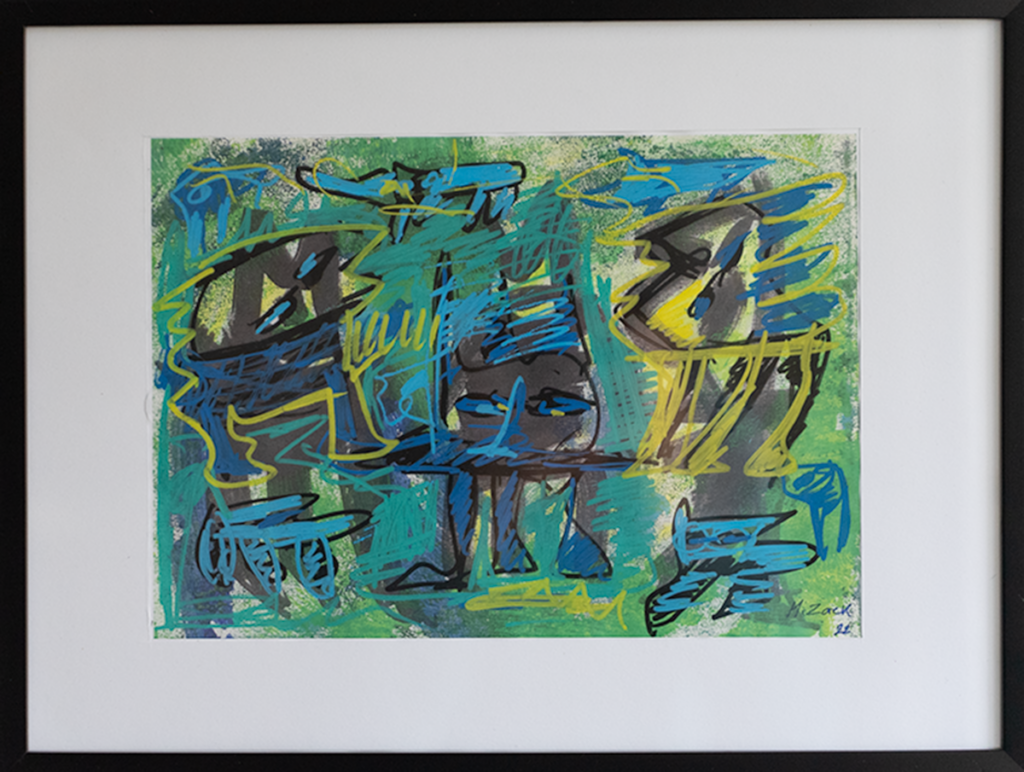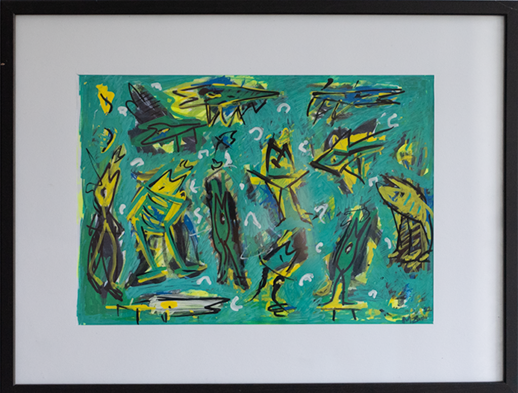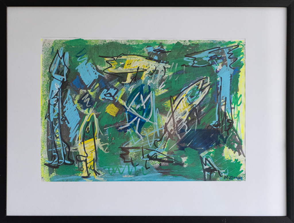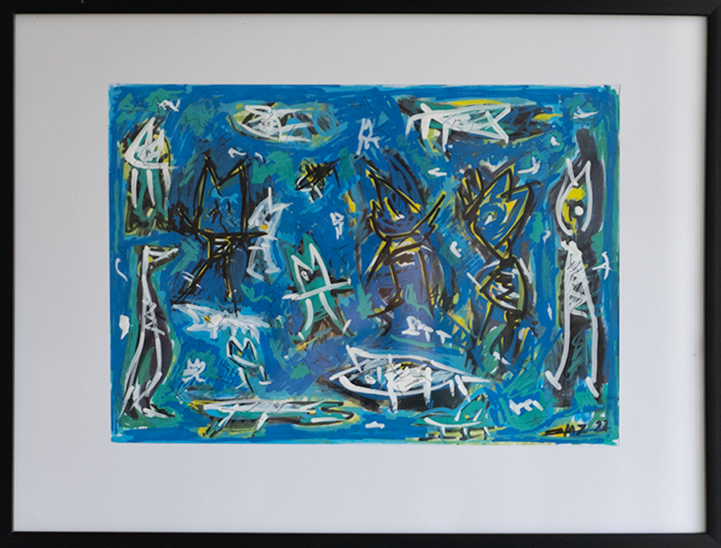 Akryl, tusch og oliepastel på papir, 30 x 40 cm med ramme.