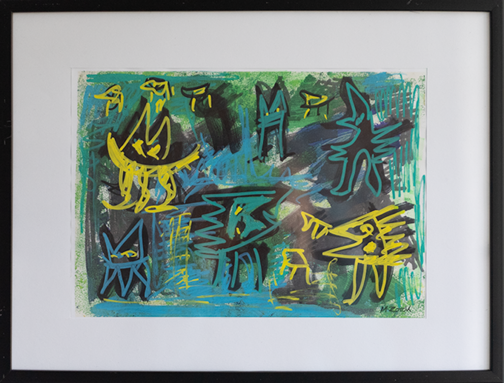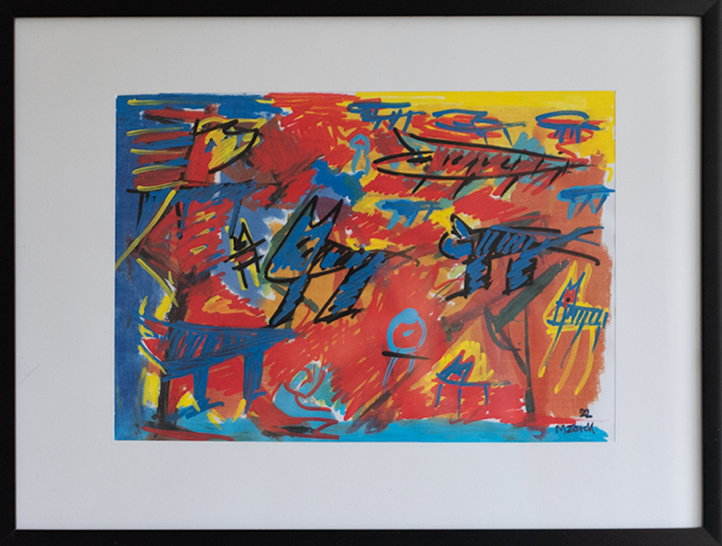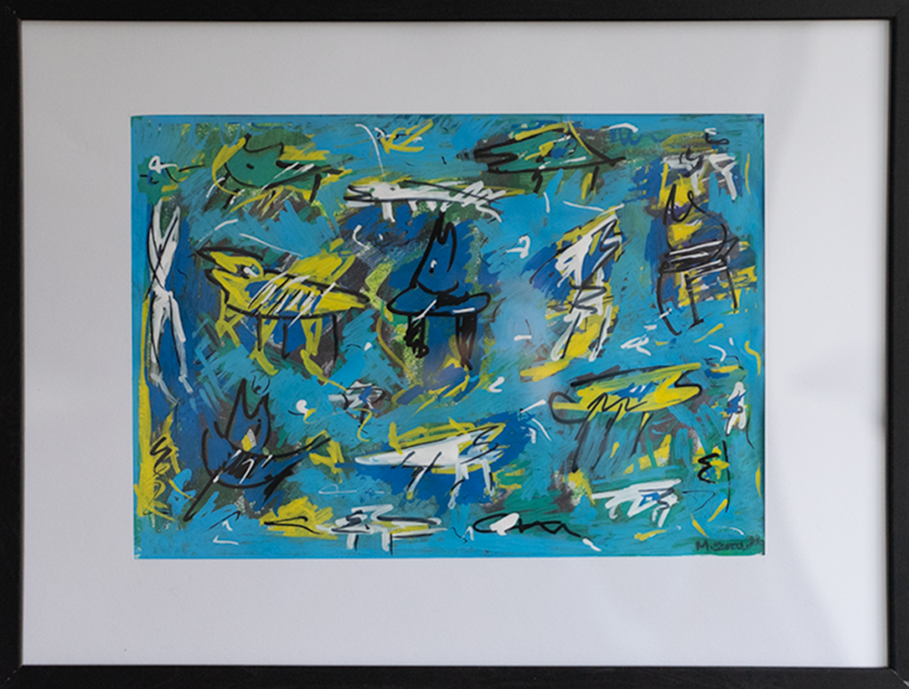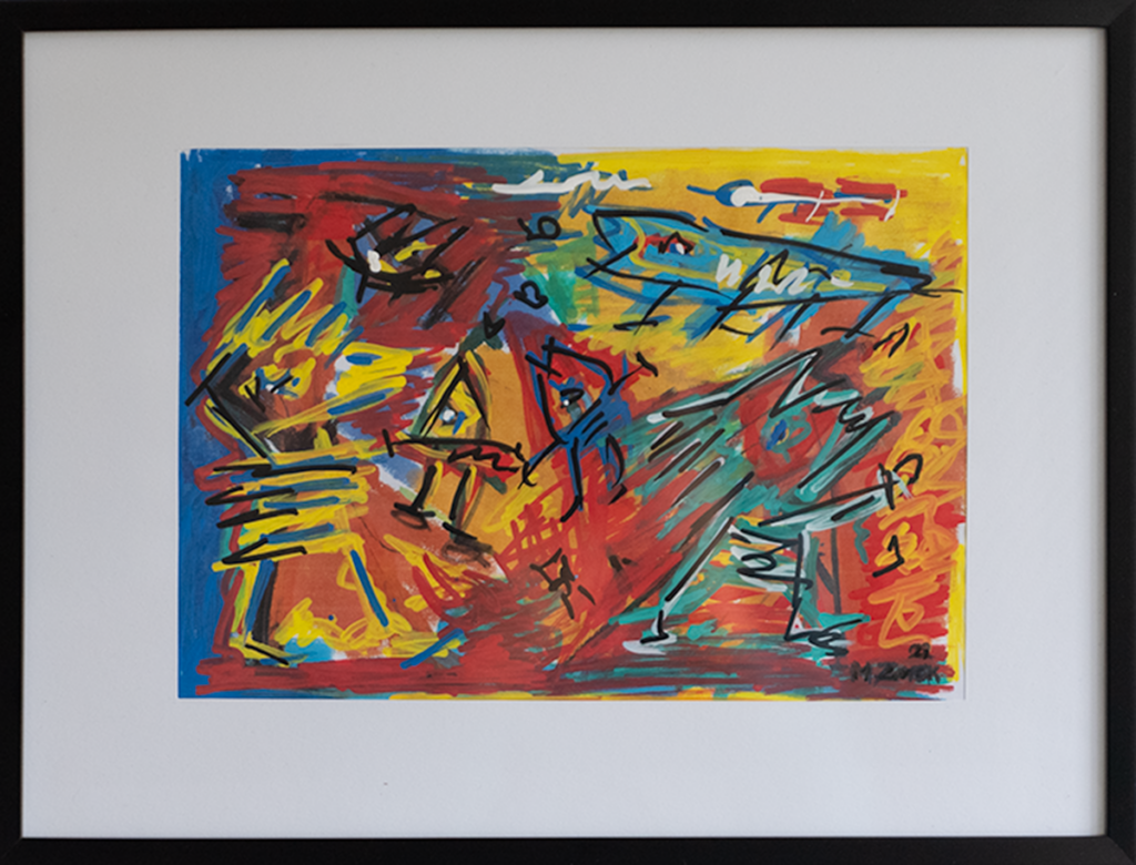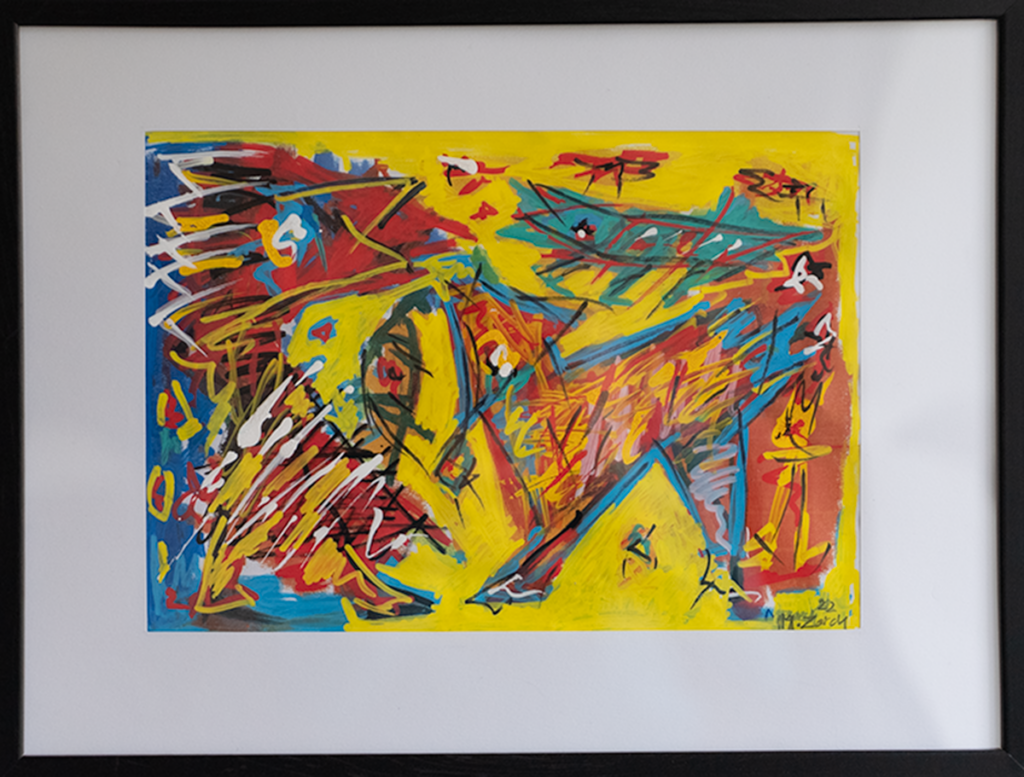 Akryl, tusch og oliepastel på papir, 30 x 40 cm med ramme.